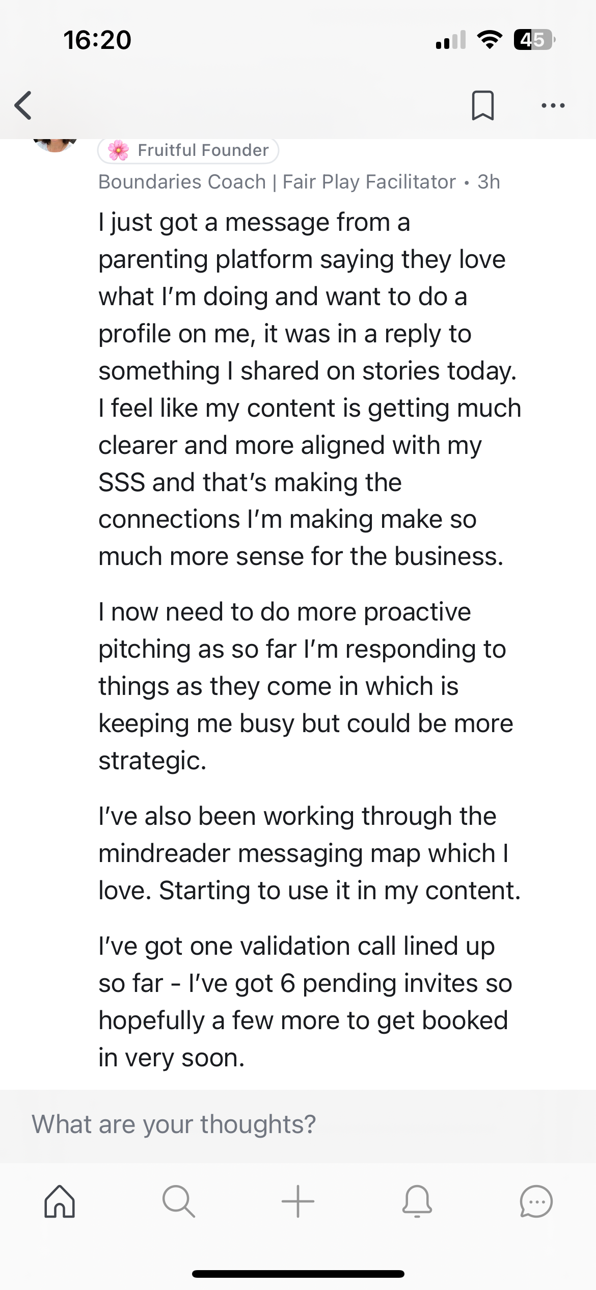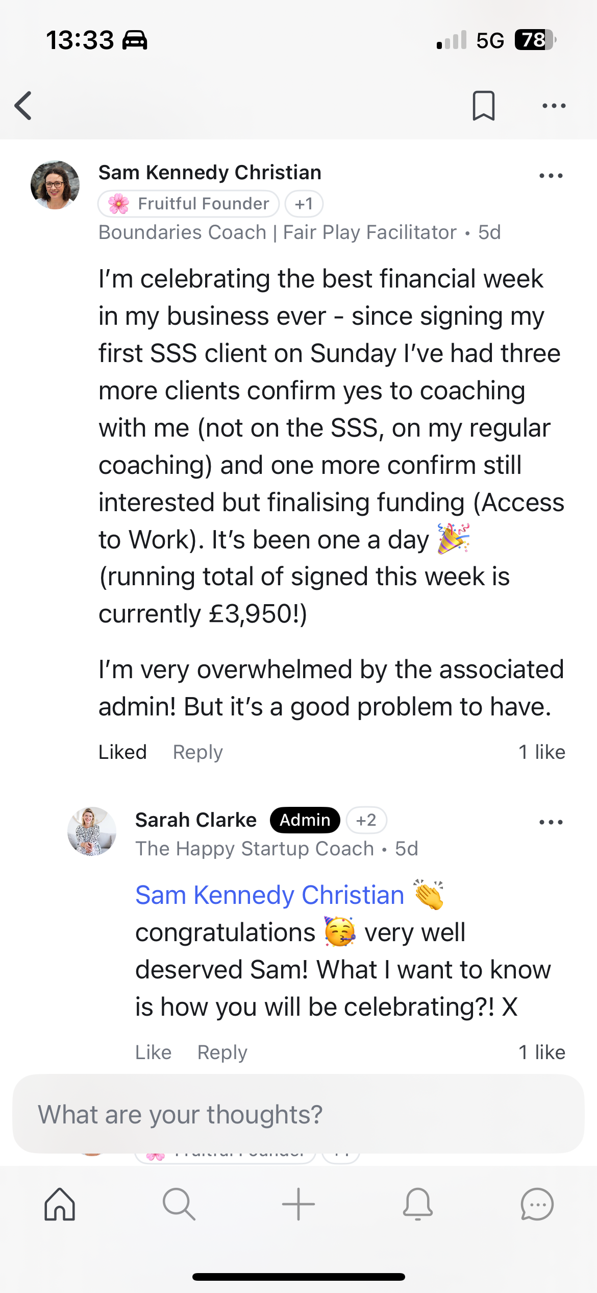 “This week I sold the first spot on my programme. And the wider confidence has supported me to make 2 other sales this week (and it's only Tuesday!). This is huge for me. I can comfortably pay myself for a couple of months from this, while also saving for tax and re-investing in things like supervision and CPD”
